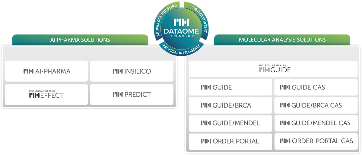 Molecular Health, das Molecular Health Logo, Dataome, Dataome Technology, Molecular Health Guide (auch allgemein als MH Guide bezeichnet) und seine Module (MH Guide, MH Guide CAS, MH Guide/BRCA, MH Guide/Mendel, MH Order Portal, MH Order Portal CAS) sowie MH AI Pharma Solutions, Molecular Health Effect (auch allgemein als MH Effect bezeichnet), Molecular Health Predict (auch allgemein als MH Predict bezeichnet) und andere verwandte Werke, Grafiken, Logos, Designs, Seitenkopfzeilen, Schaltflächensymbole, Skripte und Dienstleistungsnamen sind Marken oder Handelsaufmachungen von Molecular Health in der Bundesrepublik Deutschland und/oder anderen Ländern. Die Markenzeichen und Handelsaufmachungen von Molecular Health dürfen nicht verwendet werden, auch nicht als Teil eines Markenzeichens oder Domainnamens, in Verbindung mit einem Produkt oder einer Dienstleistung in einer Weise, die zu Verwechslungen führen kann, und dürfen ohne vorherige schriftliche Genehmigung von Molecular Health weder ganz noch teilweise kopiert, nachgeahmt oder verwendet werden. Alle anderen Marken sind Eigentum der jeweiligen Inhaber.